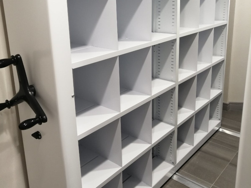В ячейках предполагается хранение экспонатов небольшого размера. Передвижные ячеистые стеллажи позволили в два раза увеличить вместимость фонда хранения. Удобная конструкция помогает поддерживать порядок, аккуратно хранить экспонаты и быстро находить нужные предметы.