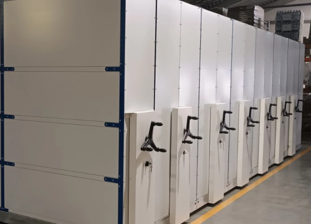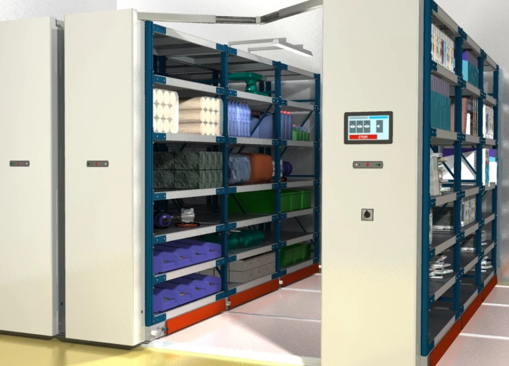 Этот тип автоматизированных передвижных стеллажей для склада оснащен электроприводом и управляется компьютерной АРМ системой. Это современное и технологичное решение.