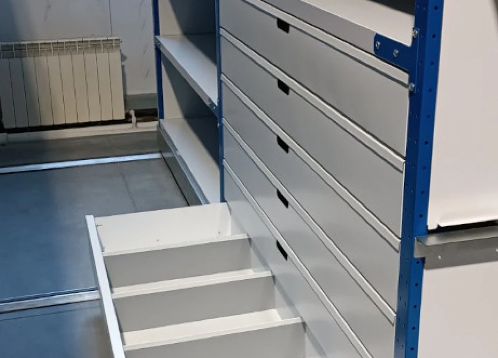 Среднегрузовые мобильные стеллажи с выдвижными ящиками для хранения мелких деталей, запчастей, метизов. Могут иметь ячейки. Используются на складе или производстве.